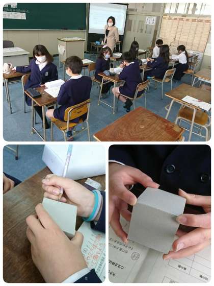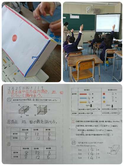 5時間目に、4年の算数の習熟度別少人数授業を見てきました。単元は「直方体と立方体 いろいろな箱の形を調べよう」でした。学習内容は、「直方体と立方体の頂点・辺・面について調べ、それぞれの特徴や性質を理解する。」です。子ども達は、頂点の数や辺の数・長さ、面の数・大きさについて、一つずつ具体物を使って確かめていきました。友達と協力しながらとても集中して学ぶことができていました。