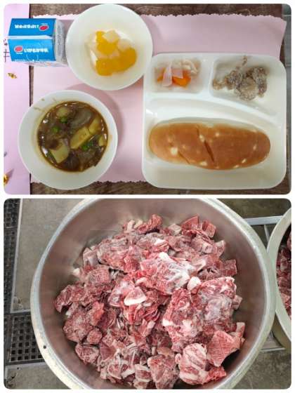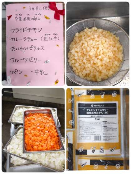 今日のメニューは、フライドチキン・カレーシチュー(近江牛)・おいわいピクルス・フルーツゼリー・さつまいもパン・牛乳でした。今日は、少し早いですが「卒業お祝い献立」です。フライドチキンは、さっくり揚がり、味付けもおいしかったです。カレーシチュー(近江牛)は、お肉がやわらかくてジャガイモがトロトロでした。おいわいピクルスは、ニンジンとダイコンが使われていて色どりがきれいでした。フルーツゼリーは、和なしとみかんゼリーが入っていて子ども達も喜んで食べていました。今日もおいしくいただきました。
