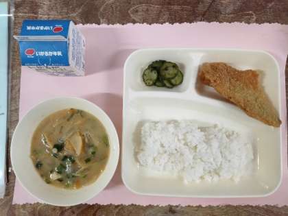 今日のメニューは、いわしのフライ・みそ汁・きゅうりの赤じそあえ・ごはん・牛乳でした。