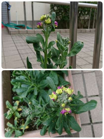 玄関のプランターで育てているストックの花が咲き始めました。かわいいお花です。つぼみがたくさんついています。
