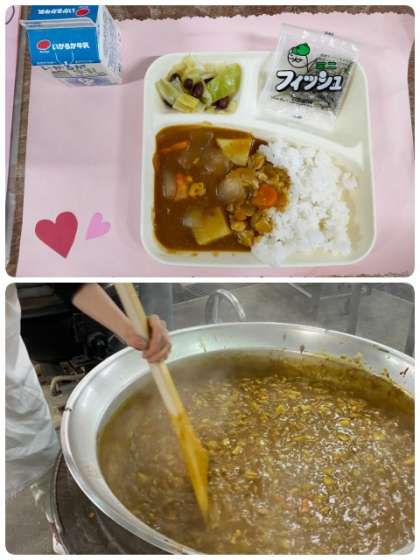 今日のメニューは、チキンカレーライス・ビーンズサラダ・ミニフィッシュ・牛乳でした。