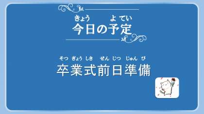 明日の卒業式の準備のため、1〜4・6年生は5校時終了後、14:35〜14:45に下校します。