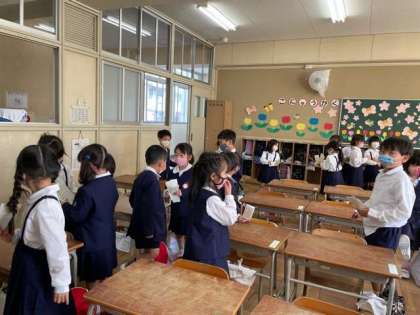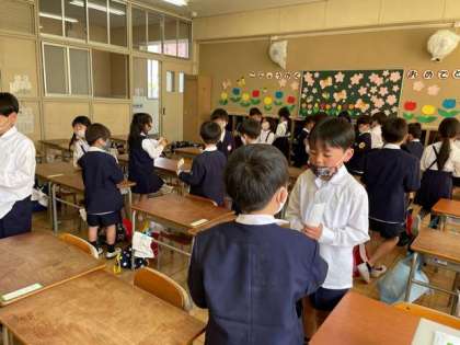 生活科の学習で自分の名前を書いた名刺を友達と交換しました。交換するとき「私は〇〇です。よろしくお願いします。」と言って交換しました。これからたくさんお友達をつくっていってね。