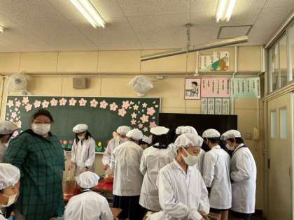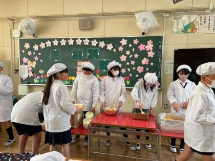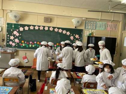 6年生が給食のお手伝いをしてくれています。配膳の仕方など、6年生が手本を見せてくれています。1年生はそれをしっかり見て学習しています。6年生のみなさん、ありがとうございます。