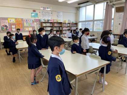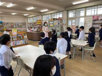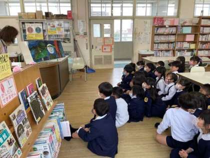 初めて図書室に行きました。学校図書館補助員の先生から図書室の利用の仕方を教えていただきました。「はらぺこあおむし」を大きな絵本で読み聞かせしてもらいました。みんな楽しそうに聞いていました。その後、ルールを守って本を読みました。