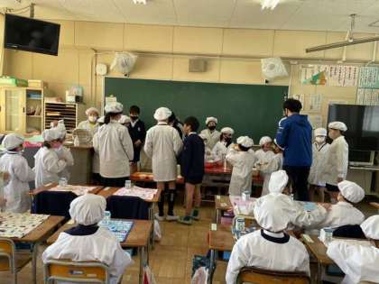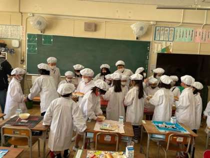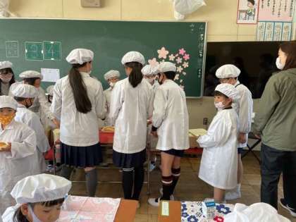 今週から給食当番がかわったので、6年生が給食のお手伝いに来てくれました。1年生が配膳するところを6年生が見守り、「こうしたらいいよ。」と優しく教えてくれました。6年生のおかげで、給食当番活動がとても上手になってきています。6年生いつもありがとう!