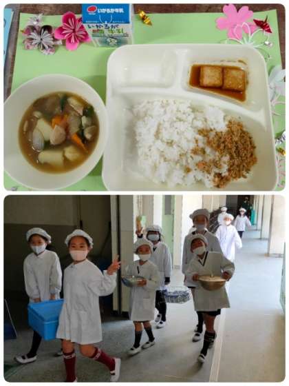 今日のメニューは、鶏肉とじゃがいもの煮もの・あつあげのしょうゆだれかけ・紅ざけそぼろ・ごはん・牛乳でした。
