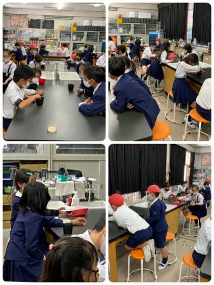4年生で種を植えました。ゴーヤとヒョウタンの種を植えました。理科室に残っていた綿花の種も植えました。
