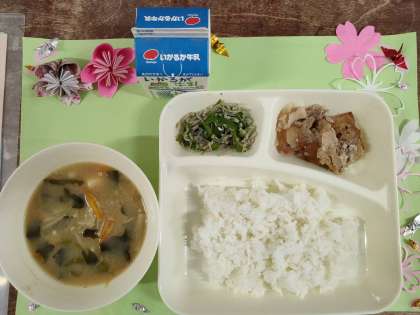 今日のメニューは、豚肉のしょうが焼き・みそ汁・じゃこピーマン・ごはん・牛乳でした。