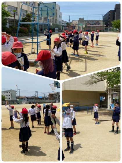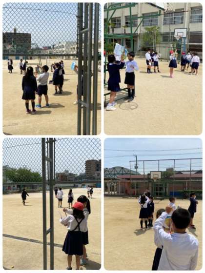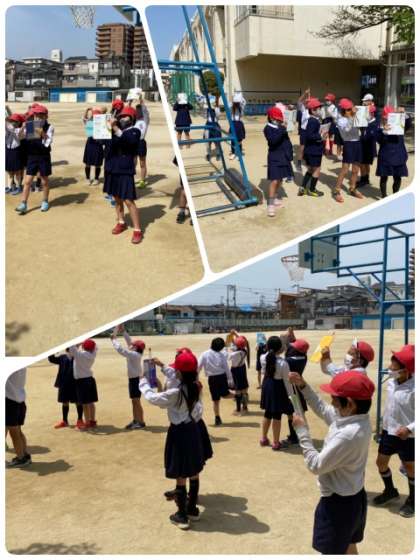 それから、運動場へ。 教科書やノートで、陰をつくりながら、思い思いに気温の測定をすることができました。