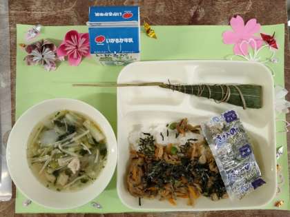 今日のメニューは、「こどもの日の行事献立」、きんぴらちらし・すまし汁・ちまき・牛乳でした。