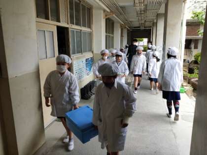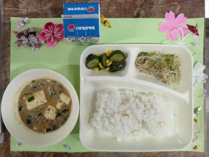 今日のメニューは、マーボーどうふ・きゅうりとコーンの甘酢あえ・もやしとピーマンのごまいため・ごはん・牛乳でした。