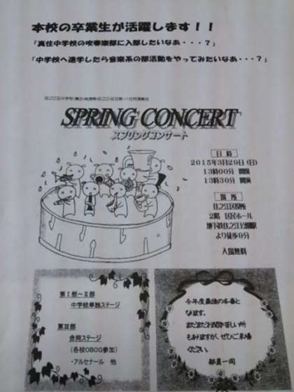 地域・学校間連携イベントのお知らせ(第2報)です。3月29日(日)13:30〜住之江区民ホールで「住之江区中学校合同演奏会スプリングコンサート」があります。本校の卒業生が多数参加するようです。中学校に進学して音楽系の部活動を希望されているご家庭は参加してみてください。
