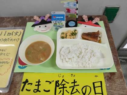 今日のメニューは、あかうおのしょうゆがけかけ・みそ汁・えんどうの卵とじ・ごはん・牛乳でした。