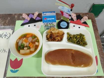 今日のメニューは、ケチャップ煮・さんどまめとコーンのソテー・りんごのクラフティ・パン・牛乳でした。