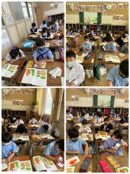 国語科「あめですよ」を学習しています。読み方を考えて音読の練習をしています。雨が好きな生き物と雨が嫌いな生き物の絵を描きました。生き物になりきって対話する予定です。