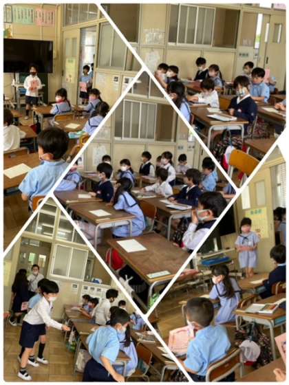 生活科の学習で2年生が1年生を連れて、学校の中を案内しながら回っていく学校探検を行います。今年度は、一緒に学校探検を行うことができないので、2年生が事前に学校のいろいろな教室をビデオで撮って紹介しています。今回は、2年生が1年生に学校探検カードをプレゼントしました。