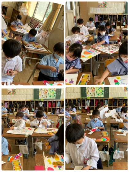 図画工作科の学習で、自分が好きなものを描いた絵を一つ一つ切っていきました。はさみを使ってていねいに切りました。次は画用紙でかばんを作っていきます。どんなかばんができるのか楽しみです。
