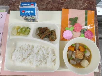 今日のメニューは、ちくわのいそべあげ・あつあげとさといもの煮もの・あっさりキャベツ・ごはん・牛乳でした。