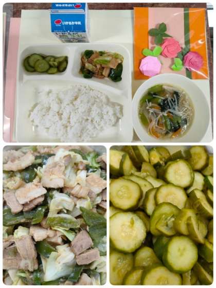 今日のメニューは、ホイコウロー・中華スープ・きゅうりのピリ辛あえ・ごはん・牛乳でした。