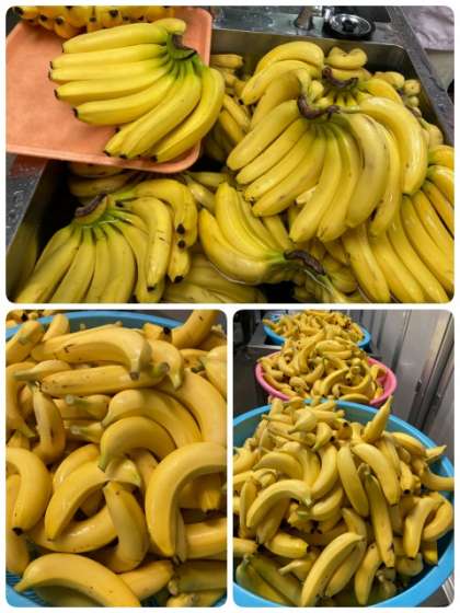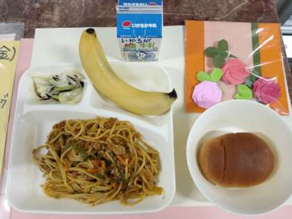今日のメニューは、カレースパゲッティ・キャベツのひじきドレッシング・バナナ・パン・牛乳でした。