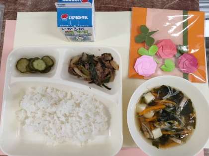 今日のメニューは、プルコギ・とうふスープ・きゅうりの甘酢づけ・ごはん・牛乳でした。