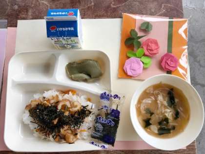 今日のメニューは、かやくご飯・みそ汁・まっ茶ういろう・牛乳でした。