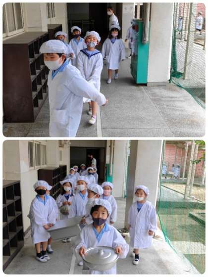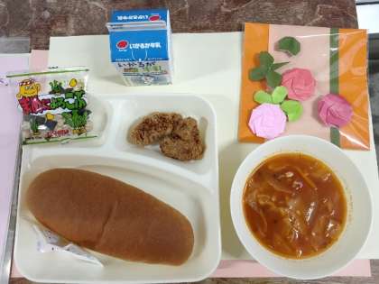 今日のメニューは、一口トンカツ・ミネストローネ・豆こんぶ・パン・牛乳でした。