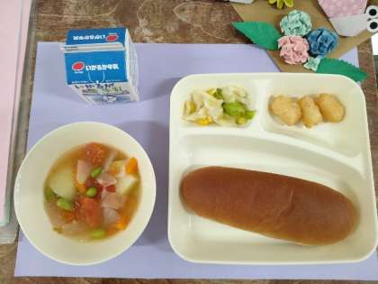 今日のメニューは、いかてんぷら・フレッシュトマトのスープ煮・サワーソテー・パン・牛乳でした。