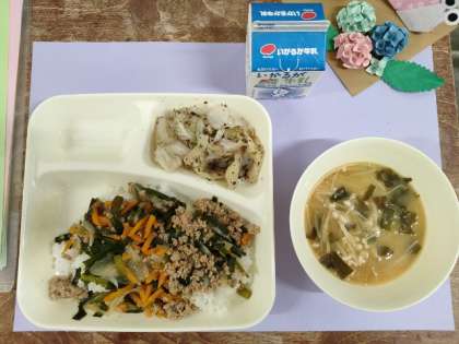 今日のメニューは、豚ひき肉とにらのそぼろ丼・みそ汁・キャベツの赤じそあえ・牛乳でした。