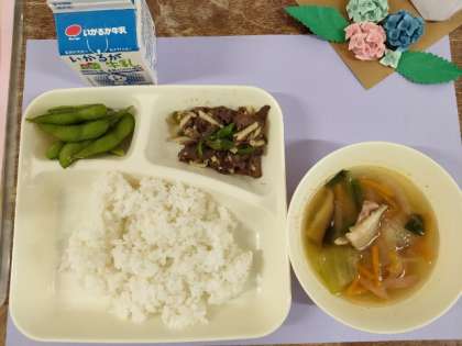 今日のメニューは、チンジャオニューロウスー・ハムと野菜の中華スープ・えだまえ・ごはん・牛乳でした。