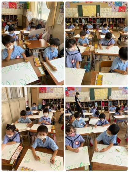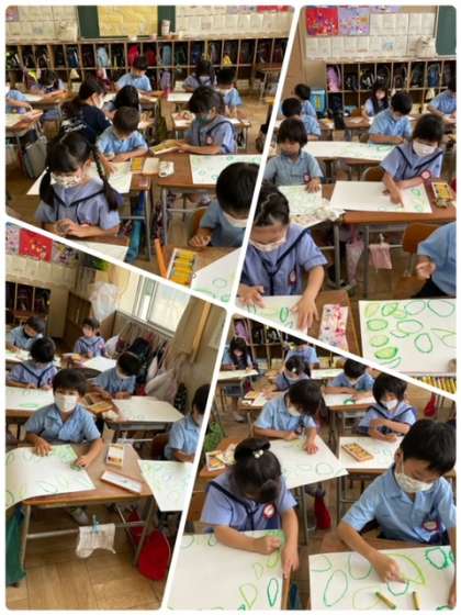 図画工作科であじさいの葉をかきました。指でパスの線をこすってぼかしました。その後、かたつむりやかえるなどをかきました。楽しくかいていました。