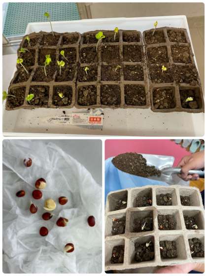 3年ほど前に鹿児島の桜島大根の種を手に入れたので、子どもと一緒に植物の成長を見ていくことになりました。3年前の種ということで、発芽するかドキドキでしたが、種を水につけた二日後、たくさんの根がでてきました!種の発芽を見る前に、どこから根が生えてくるのかを一緒に考え、実際に根を見ました。すると、子どもたちが嬉しそうに「そこから生えるんや!」と驚きながら、根に顔をぐいっと近づけて観察していました! そして、苗づくりをしました。この桜島大根がどうなるのか、子どもたちとわくわくしながら、引き続き観察していきます!