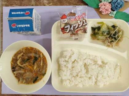 今日のメニューは、マーボーはるさめ・チンゲンサイともやしの甘酢あえ・アーモンドフィッシュ・ごはん・牛乳でした。