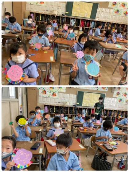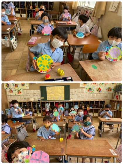 紙皿と折り紙と画用紙を使って、立体的なかたつむりを作りました。紙皿を動かして、「かたつむりが歩いているみたい。」と嬉しそうにしていました。かわいいかたつむりができました。