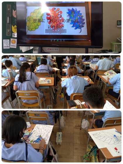 5年生が図工の時間に「世界に一枚だけの葉っぱ」を作っていました。