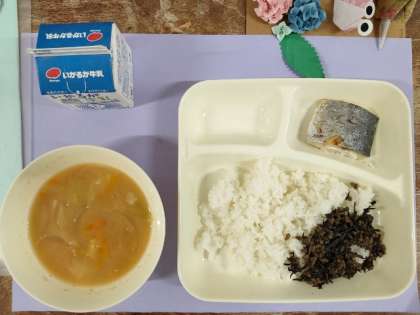 今日のメニューは、さごしの塩焼き・みそ汁・牛ひじきそぼろ・ごはん・牛乳でした。