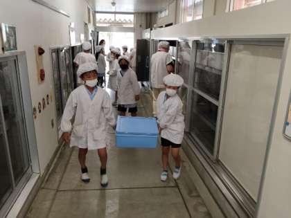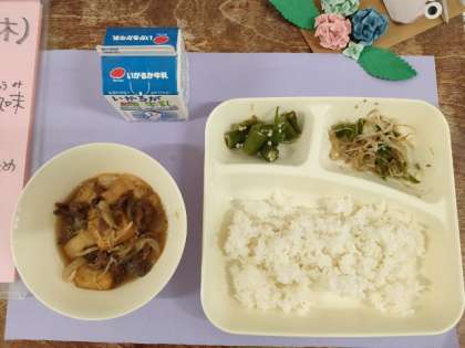 今日のメニューは、すき焼き煮・オクラのかつお梅風味・もやしとピーマンのごまいため・ごはん・牛乳でした。
