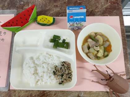 今日のメニューは、豚肉とじゃがいもの煮もの・オクラの梅風味・ツナっ葉いため・ごはん・牛乳でした。