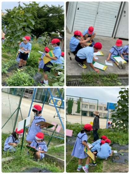 学習園の観察をしました。種をまいたマリーゴールド・ふうせんかずらの花が咲いていました。ひまわりも大きく生長しています。観察していると、ちょうが飛んできてみんなうれしそうにしていました。