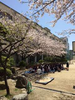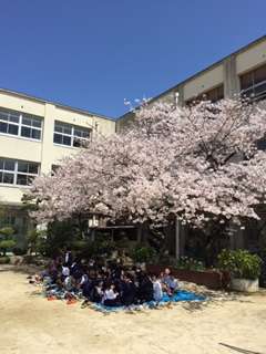 お花見日和です。「いきいき活動」の子どもたちが校庭の桜の樹の下でお弁当を食べています。