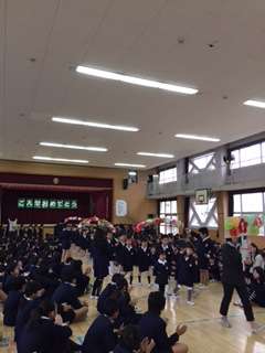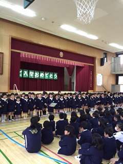 新1年生を全児童で迎える「入学おめでとう集会」がありました。みんなで校歌を歌い、新1年生に教えてあげました。