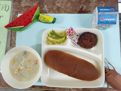 今日のメニューは、焼きハンバーグ・豆乳スープ・キャベツとピーマンのカレーソテーでした。