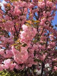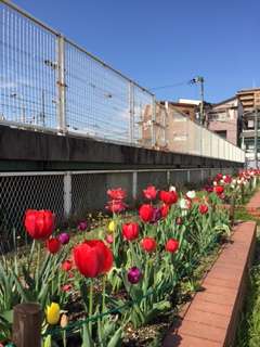 晴れてきました。運動場の子どもたち、南東門の八重桜、プール横のチューリップ、みんな生き生きしてきました。