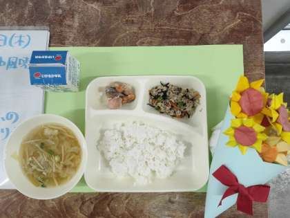 今日のメニューは、さけのしょうゆ風味焼き・五目汁・高野どうふのいり煮・ごはん・牛乳でした。