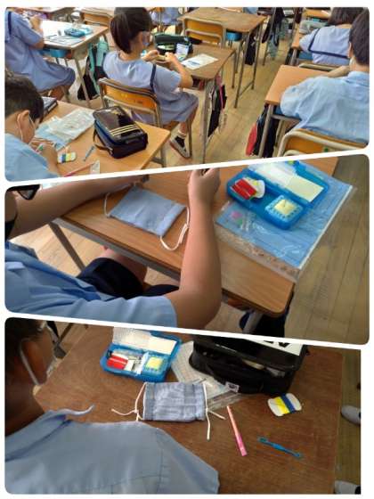 作り方の説明をよく聞いて、マスクの紐を通したり、刺繍をしたりしていました。
