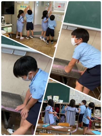 テープを使って、身の回りの長さを測りました。机の高さや台の長さなどいろいろなものの長さを測りました。まるいものの周りの長さも測りました。友達と協力して測ることができました。