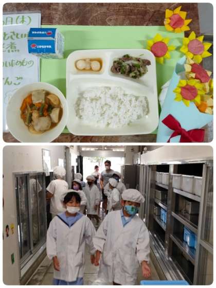 今日のメニューは、一口がんもとさといものみそ煮・牛肉と野菜のいためもの・みたらしだんご・ごはん・牛乳でした。