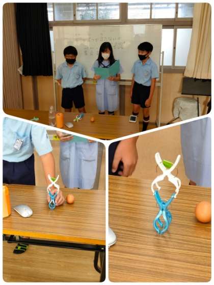 今日の児童集会は、「物が立つか立たないかクイズ」です。