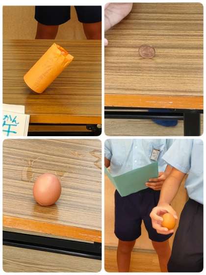 2連結の洗濯ばさみ・十円玉・少し水の入った缶・ゆで卵を使いました。